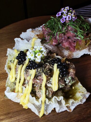 A dish on the latest menu twist turns high-end Wagyu into a playful, two-part flavour bomb. He takes hand-chopped Wagyu, makes it impossibly velvety, and stacks it onto crisp, toasted brioche. But here’s the fun part: you get two styles. One is smothered in a rich, boozy Shaoxing hollandaise (hello, Asian elegance!). The second gets a bright, palate-cleansing zing from a fresh Shiso relish. It’s cool, buttery, and utterly decadent—a perfect mouthful of high-low culinary rebellion.