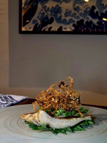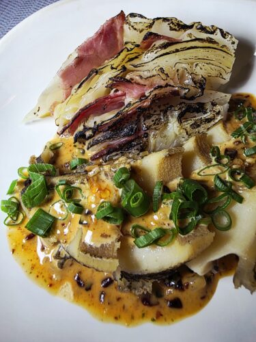 Then comes the quiet luxury of the Abalone. Forget chewing tough rubber bands; Bryan slow-cooks this prized shellfish for eight glorious hours until it’s spoon-tender. He drapes the soft abalone over sweet, braised sugarloaf cabbage and smothers it in a decadent, savoury dashi butter spiked with a sweet-spicy chili jam. It’s the ultimate comfort food, wearing a designer suit.