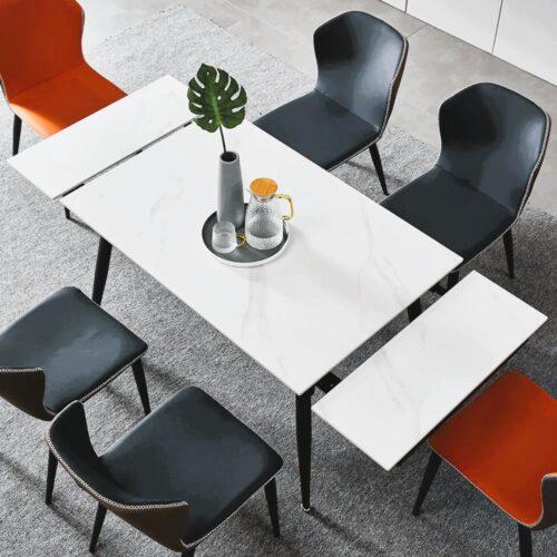 The quintessence of this design philosophy is embodied in the Lisa Extendable Dining Table (1-1.4M). Designed for the fluid nature of contemporary living, the table adjusts seamlessly from a compact 1.0m to a generous 1.4m. In its primary form, it serves as a sophisticated, space-efficient anchor for daily rituals; once extended, it becomes a grand stage for social entertainment. The table’s surface is its crowning glory—a Sintered Stone top featuring the exquisite MSH color and pattern. Far surpassing traditional marble or timber, Sintered Stone is a triumph of material engineering. It offers a non-porous, scratch-resistant, and heat-proof surface that retains the majestic veining of natural stone while offering a durability that is virtually impervious to the demands of a high-traffic household.