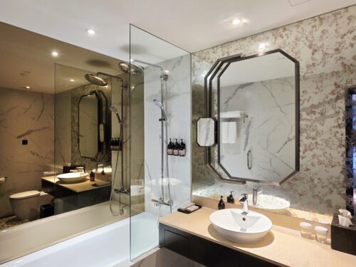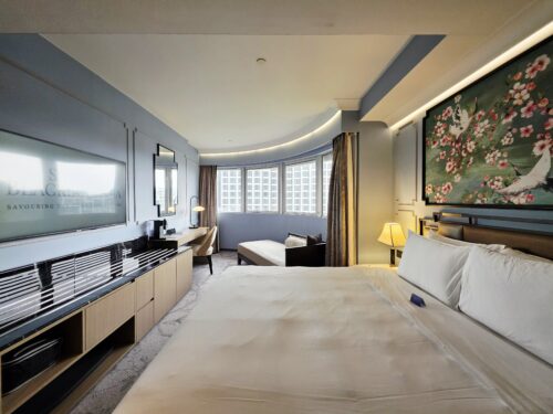 The Signature Studio is where vintage flair meets cosy indulgence. Tucked in the hotel’s cylindrical tower, the room curves gently around you, with bay windows that flood the space with natural light. The décor channels Old Shanghai elegance—baby blue walls, floral accents, and cross-shaped mirrors that feel like a stylish throwback. The marble bathroom behind the bed adds a touch of glam, and with Christian Lacroix amenities, plush bedding, and generous luggage space, it’s a snug little haven for solo travelers or couples who appreciate a bit of character with their comfort.