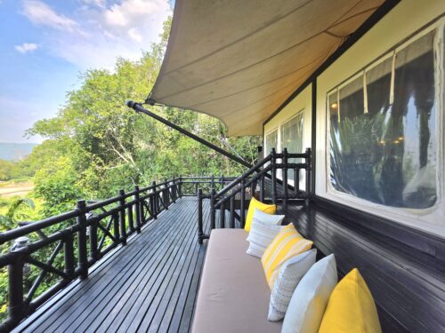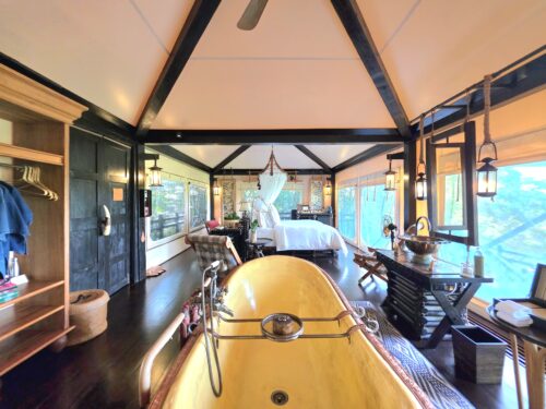 While each of the 15 tents offers exceptional cosiness and privacy, the Butterfly Tent (Tent 4) stands out as a particular jewel. This expansive, open-plan abodes seamlessly blend 19th-century adventure aesthetics with contemporary opulence. Imagine sleeping under a custom-designed canvas, enveloped by handcrafted leather/fabric and rich hardwood furnishings, while an expansive outdoor deck offers serene views of the meandering river or the camp’s gentle resident elephants.