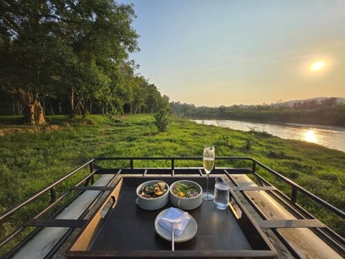 Dining at Four Seasons Tented Camp Golden Triangle is an adventure in itself, seamlessly integrated with the natural environment and tailored to individual taste. For pre dinner drinks, enjoy expertly made classic or innovative cocktails at the famous Burma Bar. For utmost privacy and personalised service in the middle of luxurious surroundings, indulge in the Bucket Sundowner where cocktails of your choice are served in a bucket lowered from the bar above, right into your own exclusive area. This is one of best spots to view the sunset while spending meaningful time with love ones.