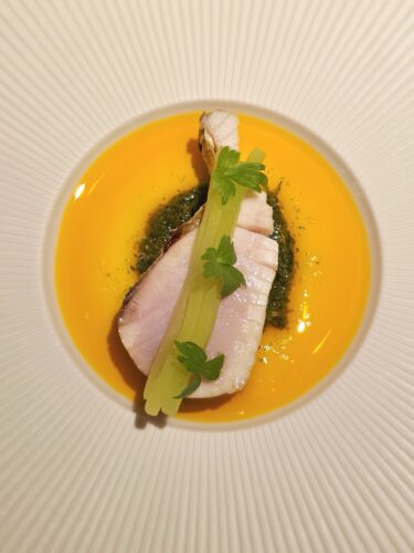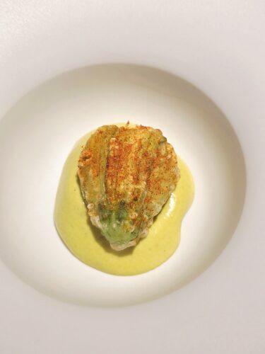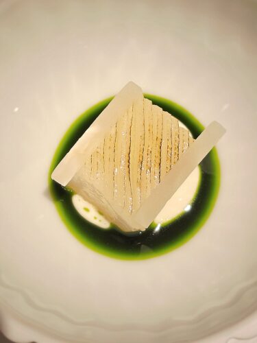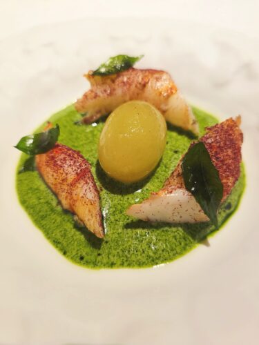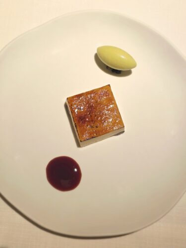 A signature highlight is the Courgette—a seasonal zucchini flower of remarkable delicacy and texture. Lightly coated and gently cooked to perfection, it is presented atop a velvety green pea purée, creating a dish that balances elegance with purity of flavor. The Prawn course is equally revelatory—a king prawn paired unexpectedly with curry leaves and peeled white grapes. The initial taste evokes green apple, followed by the springy-ness of the prawn, which Sommelier Eric Chang pairs with a crisp Riesling to neutralize the vibrant acidity of the sauce.