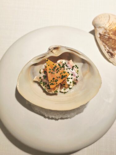 The Chef’s Omakase Menu is a ten-course exploration of texture and “expressive flavors.” The journey begins with tender Cuttlefish from Yilan; larger in scale and torched to a buttery perfection, it is served with a sour chia seed accent. This is followed by the Surf Clam served in it’s own shell, elevated by a delicate yuzu tofu sauce and a touch of sweetness from the persimmon. At Nobuo, the artistry of plating is nothing short of masterful—each composition honoring the integrity of the ingredients and celebrating the produce with reverence and precision.