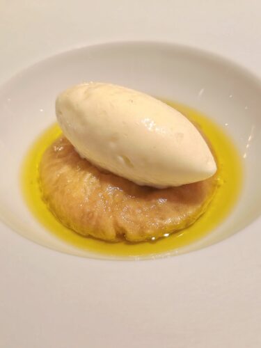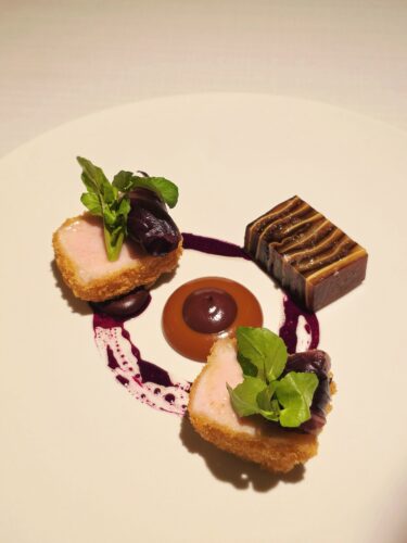 The transition to heavier flavors features the highly popular Sawara (Japanese Spanish Mackerel), delicately cooked to a tender pink interior with a lightly seared skin. Presented with a striking contrast of colours from the pesto based sauce and tomato oil. For the main course, guests can savor the Berkshire Pork sourced from Yilan or Australian Wagyu Onglet (the latter with a supplement). The juicy pork is coated in crunchy hazelnuts and served with a spiced apple sauce in the center, balanced by a sophisticated play of light sweet-and-sour glazes.