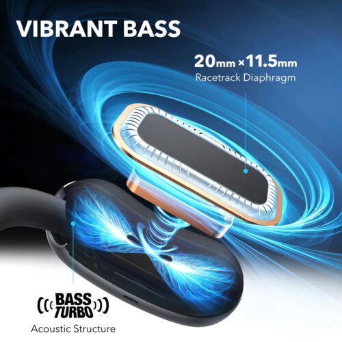 Don’t let the open-ear design fool you into thinking the sound is airy-fairy. Nope! The AeroFit 2 packs a punch with large, dynamic drivers that dish out surprisingly rich bass and crystal-clear tunes (20mm x 11.5mm drivers with BassTurbo). Thanks to some clever directional audio technology, the sound goes straight to your ears, so you won’t be sharing your playlist with the whole bus. Your calls are clear with four mics and AI enhancement.