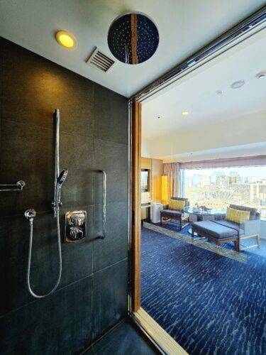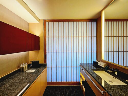 This retreat designed with understated Japanese elegance, featuring warm natural tones, refined wood accents, and expansive windows that frame sweeping views of the city skyline. It blends contemporary luxury with traditional aesthetics, offering premium in-room amenities and a serene atmosphere. Thoughtful sliding panels allow guests to segregate the living space with the bathroom and wash area.